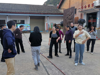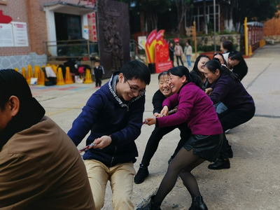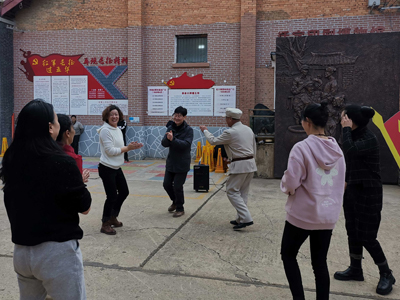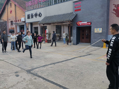 讲解员是个可爱又多才多艺的大叔,刚在他的带领下参观完一场“视觉盛宴”,立马又被他拉入了一场的“歌舞盛宴”。就地围拢,广播体操、民族舞应接不暇,载歌载舞,尽情释放活力。跳绳、拔河、踩高跷、打陀螺各种趣味活动也让大家欢快不已,整个场面热闹非凡,快乐中拉进了彼此间的距离。